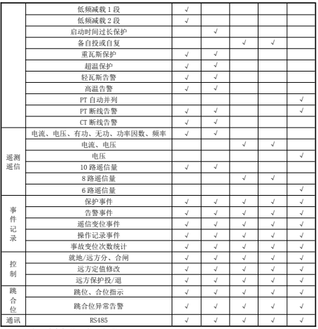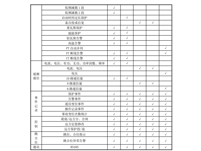 微機保護裝置功能配置表:
